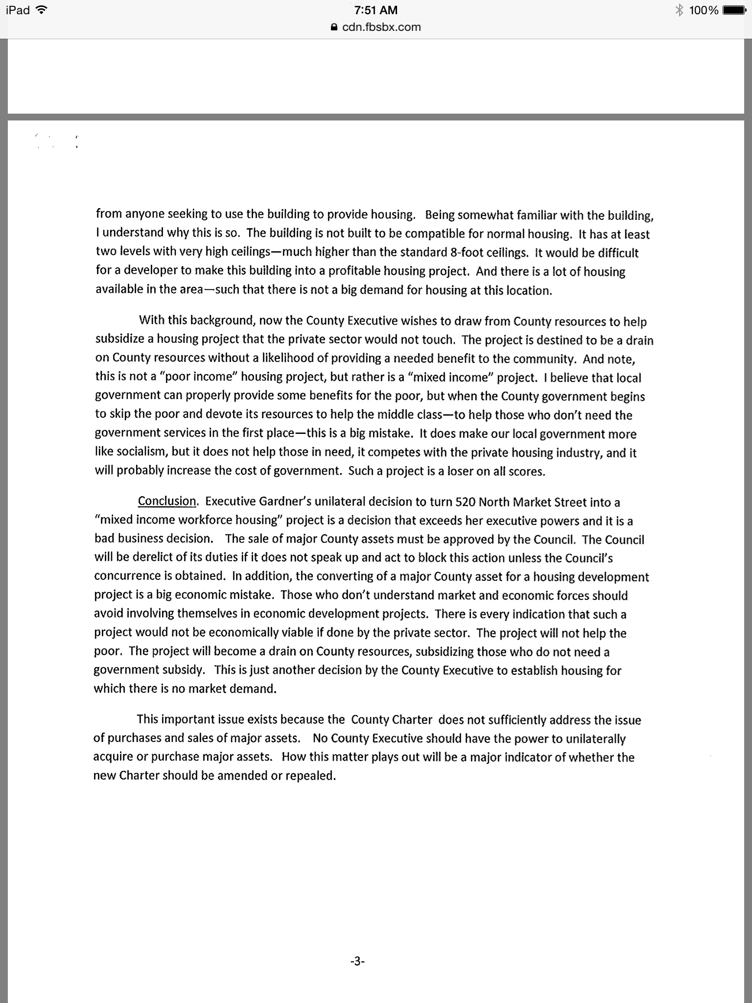 Executive Gardner’s unilateral decision to turn 520 North Market Street into a “mixed income workforce housing” project is a decision that exceeds her executive powers and it is a bad business decision.