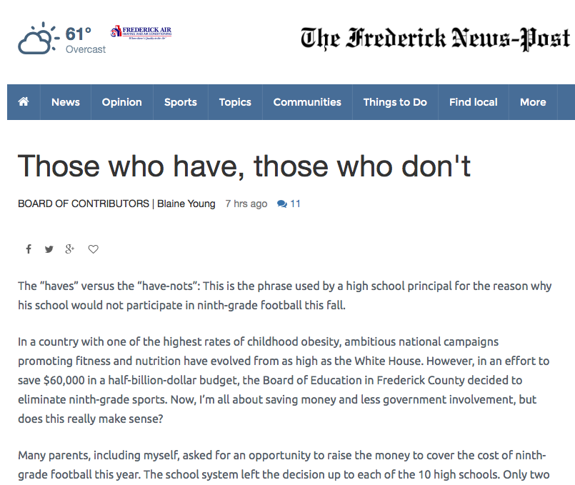 And moving right along, what is all this noise about sports for anyway? This same logic should apply first and foremost to sorely needed school construction. The primary purpose of schools is education (duh). Before we get involved in complaining that FCPS builds new sports stadiums according to modern standards, and old stadiums are old–this is really as stupid as it sounds, isn’t it?–we should be hearing Mr. Young advocating for modern *school* buildings in Middletown and Urbana and Waverley, where they are still using open concept floor plans as though it is 1970. Or for the students of Centerville, who started out with a shiny, happy new school that could hardly begin to hold all of them.  And for the students of Hillcrest.  If memory serves, the portables are now so old they are visibly decaying. How is anyone supposed to take this Blaine Young turf war seriously? Kudos again to Hillcrest and Urbana’s PTA communities for not turning a shared need for construction funding into their own turf war.