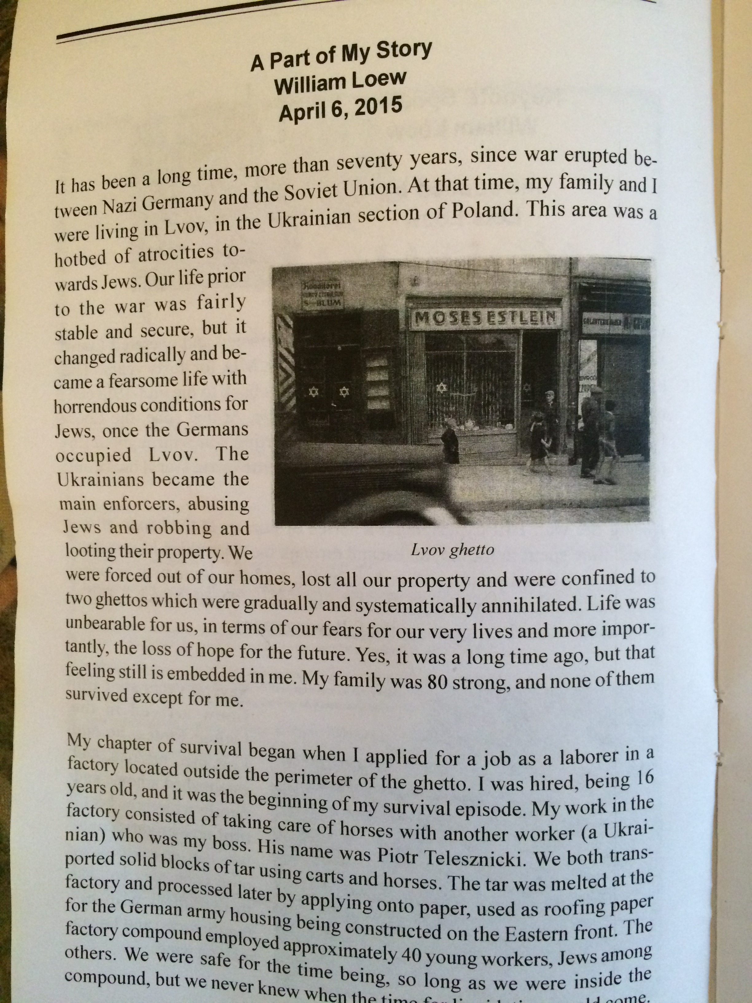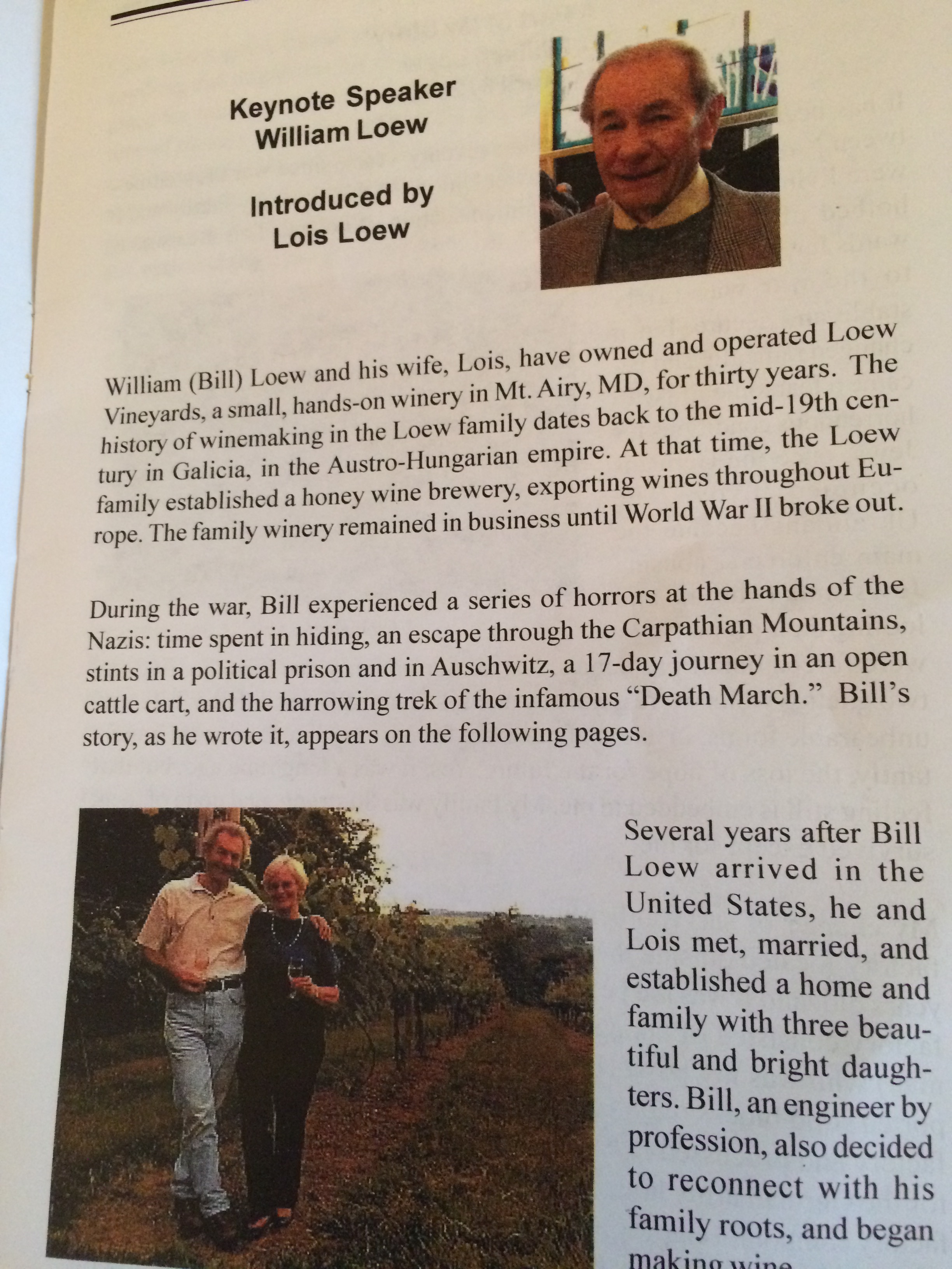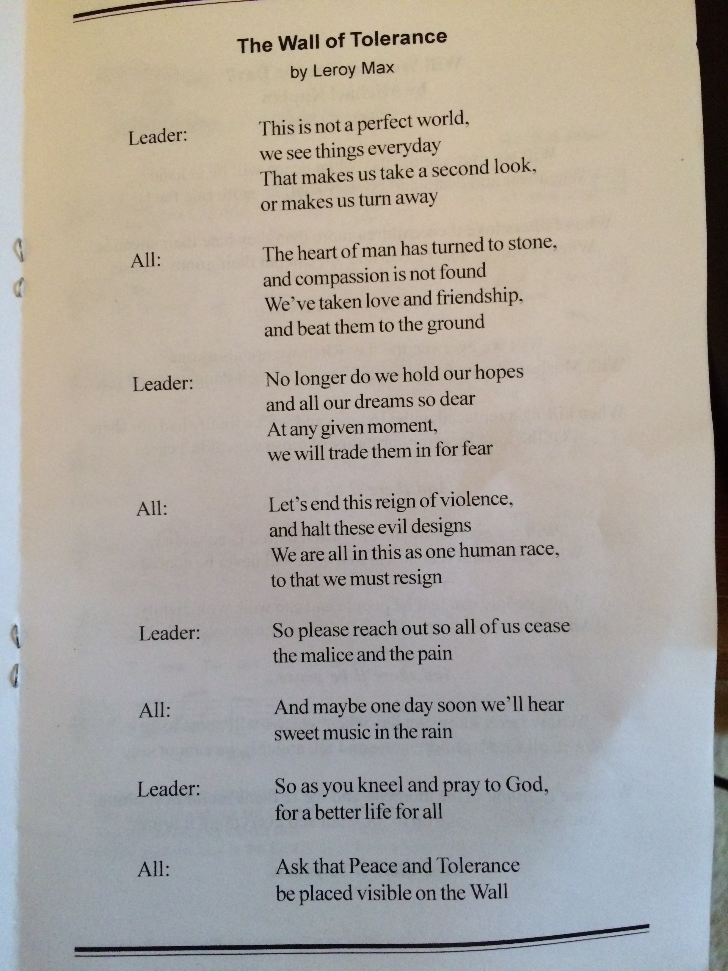 Below  I will post pages from today’s program for you to peruse on your own. The hightlight of the ceremony was a very moving story of his own survival from Bill Loew, owner of Loew’s winery in Mount Airy. As powerful and important as his story was to listen to, equally valuable were the examples in which intolerance has spurned violence since the Holocaust. From Cambodia to Bosnia to modern-day Syria, humanity still has not learned the lessons of the past. One young lady recounted a story of what happened to a young Latino friend at Francis Scott Key mall the other day. Someone assumed she was Mexican (I am assuming from the language she used that the young lady was not, even though that really does not make any difference) and yelled, “Go back to your country!” If you think it’s a stretch to make a connection to a comment like that to genocide I would invite you to do some reading of the rise of the Nazi party. All bad things start with bad words.