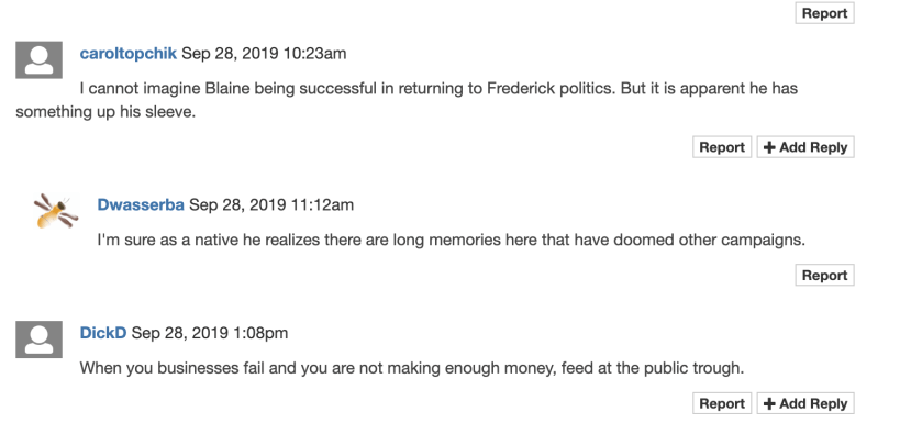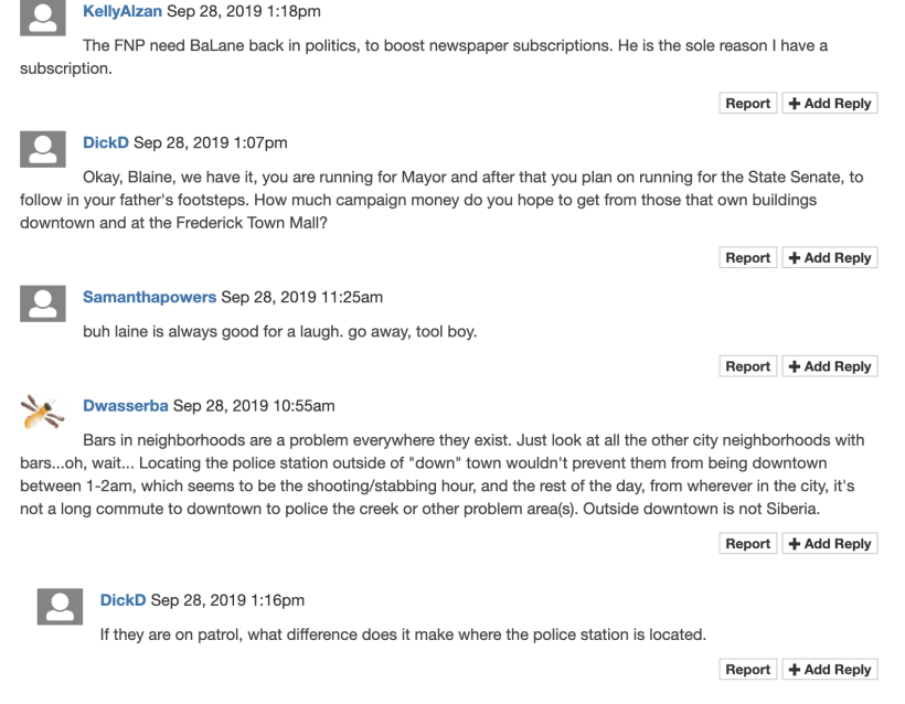 To catch up go ahead and click here to see all we’ve written about him over the past 4 years! In this particular LTE he is making the false equivalency of retail stores leaving Downtown Frederick to the new police headquarters possibly being located slightly out of the realm of the hustle and bustle of the downtown restaurant scene. It’s pretty dumb considering that most officers are out on patrol and not just sitting around the headquarters waiting for a call. What we really like is how every time he writes one of these thinly veiled campaign messages, the FNP commenters tell him exactly what they think!