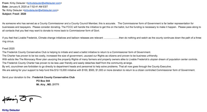 No Kirby! That will not do!We’ve paid very close attention to the new county government since its inception in 2014. We know that every claim that Kirby makes here is false. The Monocacy River Plan does not take anyone’s land, and we cannot even begin to decipher what he means by population center controls when it comes to the Livable Frederick Plan. What is meant by less user friendly is up to wild speculation, as is his statement about the government being detached from the community at large. We all lived through the Blaine Young BOCC and nothing about that board was user-friendly or attached to the community-at-large. (Click here for more on that.) Did this “fiscal conservative” even consider the cost of switching back to a system that made sense when we were a small rural county, but is no longer adequate for our current needs? Which is the very reason we decided to change the system!