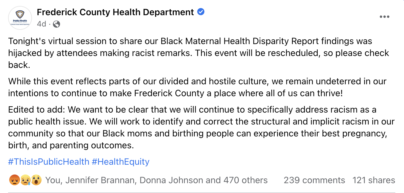 The whole debate about CRT and teaching kids accurate history emboldens ignorant folk, like the ones that thought it was A-OK to come into a public health meeting and spew their vitriol all over everyone else. When we allow people to ban courses on African American history, when we refuse to acknowledge the actual history of our country, and when we sit back and feign surprise this incident occurred; we allow these bad actors a stage. And we are all to blame for it.