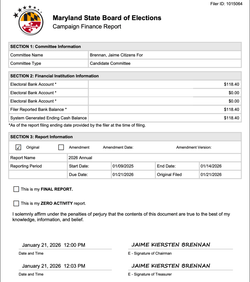 While we were discussing with our circle of Yokels all the recent Board of Education campaign reports, one of our inner circle pointed out a big no-no. In Jaime Brennan’s most recent filing, she signed her own name as treasurer.