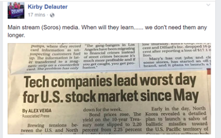 The prevailing scholars at present concur that Delauter is implying #fakenews, and the statement “we don’t need them any longer,” must be interpreted as an insistence that the only news others should read is the propaganda disseminated via Facebook videos Trump’s minions produce, the Increasingly Nuclear Twitter War Tweets of POTUS himself, and retweets from members of his “intellectual” coterie. One notable local member is Councilman Billy Shreve. This is a device one will see frequently employed within the wing nut genre: by employing a heavily loaded allusion, such as the one to Soros, his reader is immediately aware of the team he plays for. It is critical for the writer convey that he is not on the team of reason and science and engineering and physics, dear readers. His allegiance is to #teamcovfefe, also referred to in texts as A Basket of Gullibles.