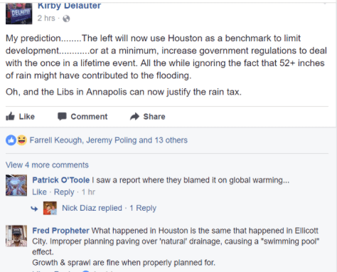 LOLOLOLOLOLOLLLLLLLL look what we found before we published! You fool. It’s used to justify it because the facts check out. Your pal Fred Propheter is correct–proper planning (including funding mitigating drainage systems to handle the water) is necessary. You have to pay for that somehow! Now we get to tag Kirby Delauter and the CE race in this. Well played, social media treasure trove! You be you!