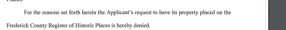 What the heck is even going on? A judge has remanded another frustrating thing back to the Frederick County Council, saying that they did not explain the reason for their vote that kept Trout Run from receiving a historic designation. (Umm…they said it wasn’t a special piece of local history?) Nobody apparently told Judge William R. Nicklas, Jr. about the shall versus may voodoo. Maybe the people who have since trotted that line out with regard to other issues should use the argument more conservatively.