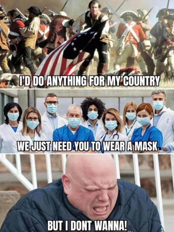 There is a growing movement amongst the “F All Y’all and Yer Feelings You Rode In On” crowd to reject the wearing of masks in public because it is “the mark of compliance.” As free and sovereign citizens they are now deciding in lieu of taking into account the health and wellbeing of others through required mask etiquette in essential businesses that they shall take their potentially infectious droplets and breathe them into the retail outlets of neighboring counties. Until they make their own rules when all the vitriolic fools of Appalachia turn up to exhale virus on them…