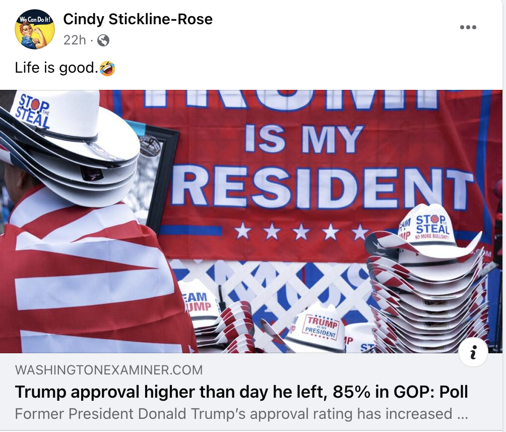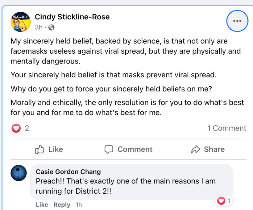 Thrice loser, Cindy Rose, is hoping all this fraudulent election stuff (Trump is going to be President again don’t ya know!), harmful vaccines, unhealthy kid muzzles, and teaching people about the actual history of the U.S.A. is finally going to be her ticket to a place on the board.