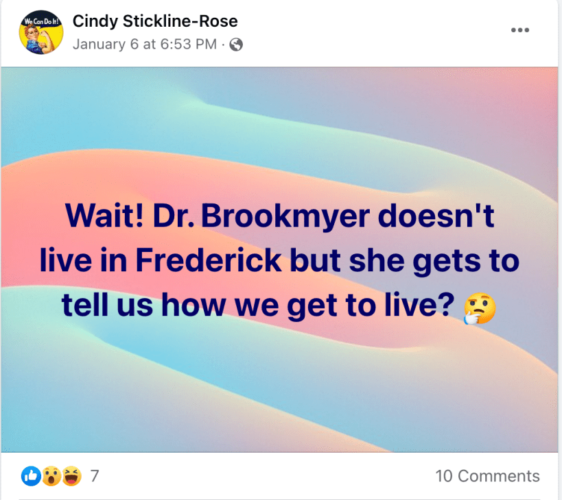 But let’s back up to that comment about the cameras in the classroom. First of all, it is illegal to record anyone with sound in the State of Maryland without their consent. That would mean that these cameras (and by the way, who would be monitoring those?) would not record sound, which means that any interaction would be open to all kinds of interpretation. And you know what? A policy like this would lead to a whole lot of FCPS teachers going elsewhere! Who wants to deal with a parent like Cindy Rose trying to dissect and invent captions for every little interaction?! No teacher gets paid enough to deal with that!