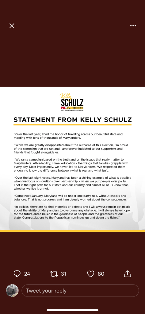 Our two Frederick County GOP gubernatorial candidates faced off with the dumbest one winning. From this concession post, we don’t think that Kelly is going to be backing him in the general!