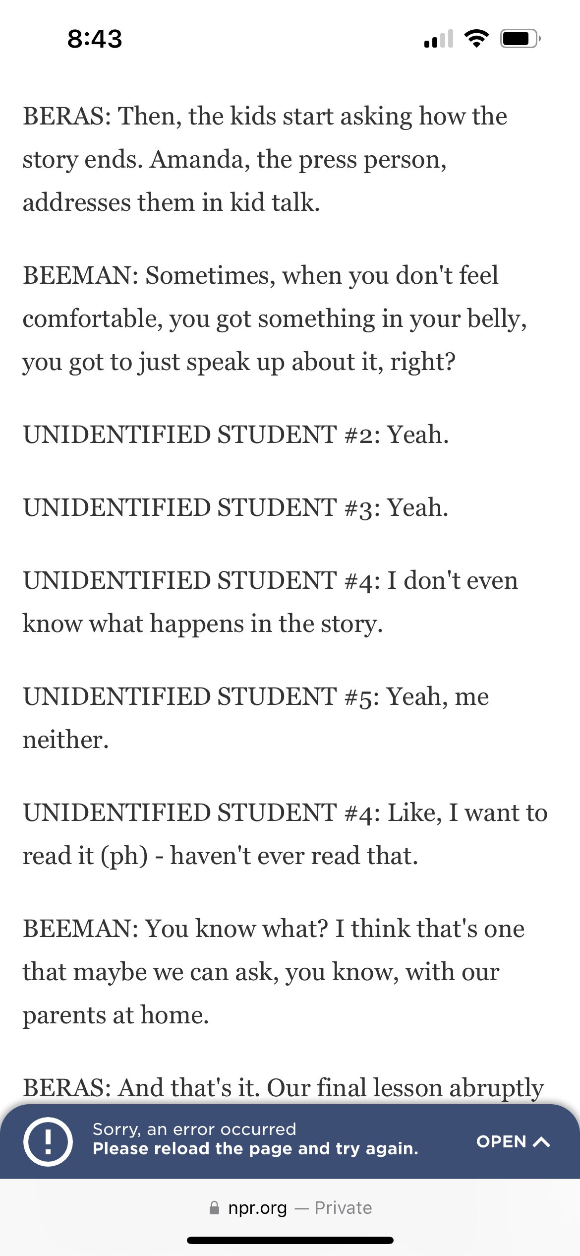 If we know our readers, and we think we do, most of you are probably crying over your computer or clenching your fists in rage. (Unless you are Cindy Rose who is probably rejoicing at this interaction). What really gets us is even the 9 year olds know what happened is bullshit. How in the world is it appropriate to first, cut off a Dr. Seuss story the kids were enjoying, and secondly make the kids who were making connections to history and the story feel as though they did something wrong? It’s the direct opposite of what should occur in a school. The lesson is that we need to protect our schools and their libraries from this kind of nonsense. For ignorance has no placed in our schools.