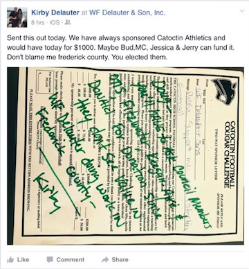JeezLouise. This guy. He’s clearly mad that Frederick County (belatedly joining the rest of Maryland) is also not going to be hiring its council persons to do their construction work. Airing his grievances like this happens to really get our knickers into knots. If his business was so dependent upon Frederick County in order to profit, the least he could have done was sincerely look for other donors to help Catoctin High School Athletics. Assuming a county school would be unlikely to get into a political brouhaha with a county council member, we will ask on his disgusting, self-serving behalf.